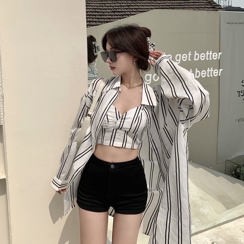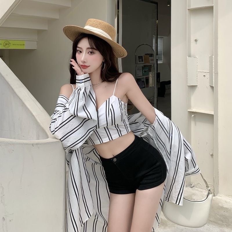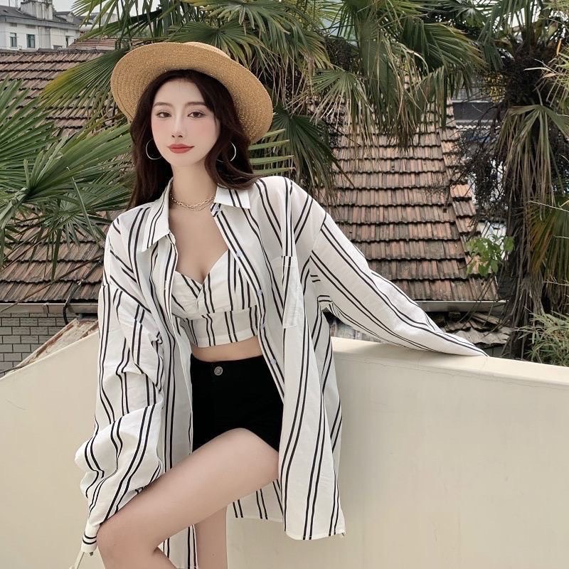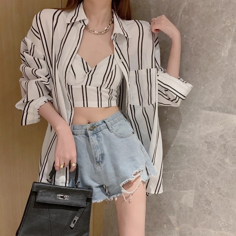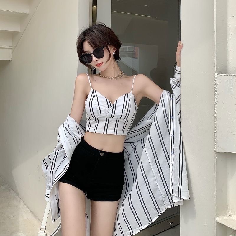 PROMO korean premium Jennie Set Tanktop & Kemeja Motif Garis / Setelan wanita bahan Sifon motif garis impor /Beachwear