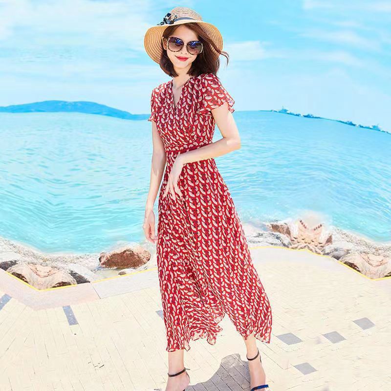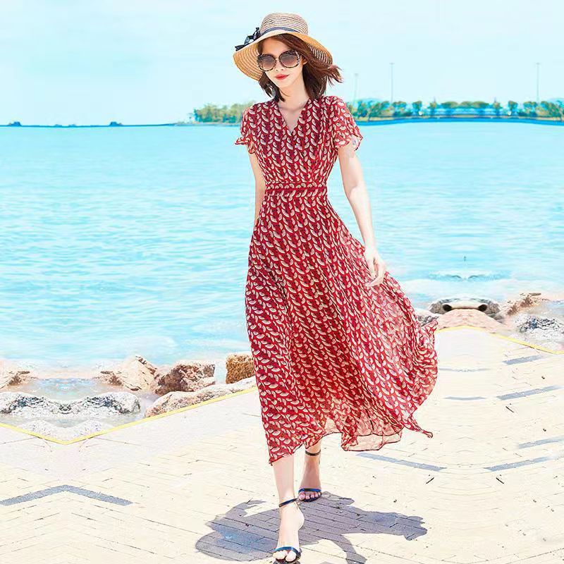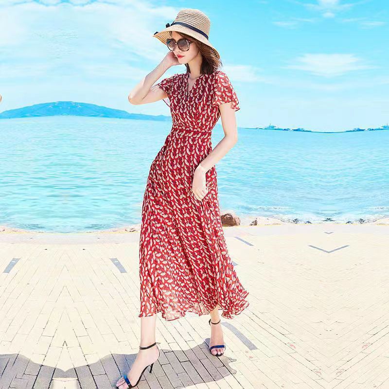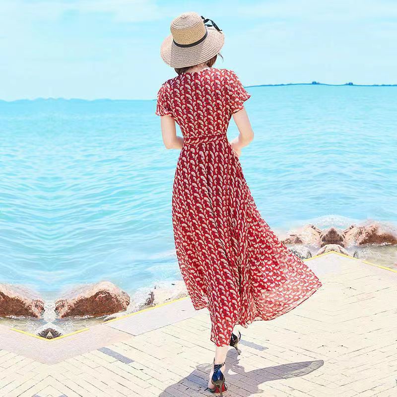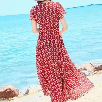 2022 Dress sifon setengah panjang sablon Lengan Pendek Rok Pantai Lutut Rok Tipis Bunga