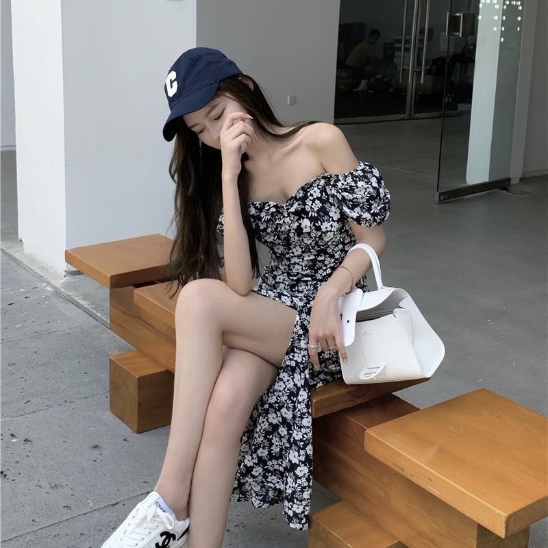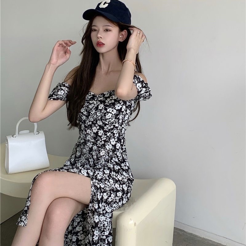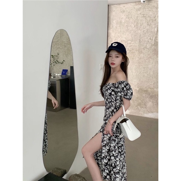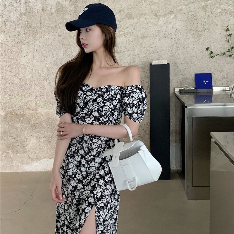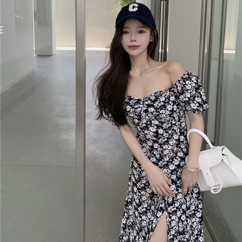 D177- Korean Vintage Midi dress motif flower casual style Square neck Sabrina style / Gaun wanita murah bergaya Korea ke