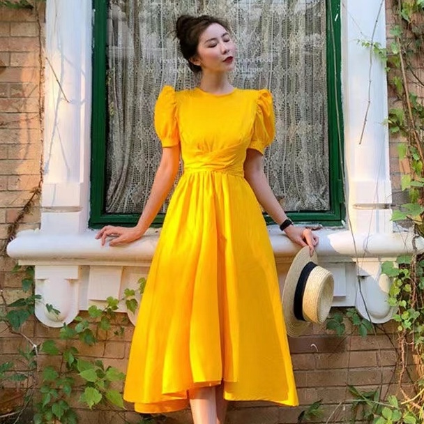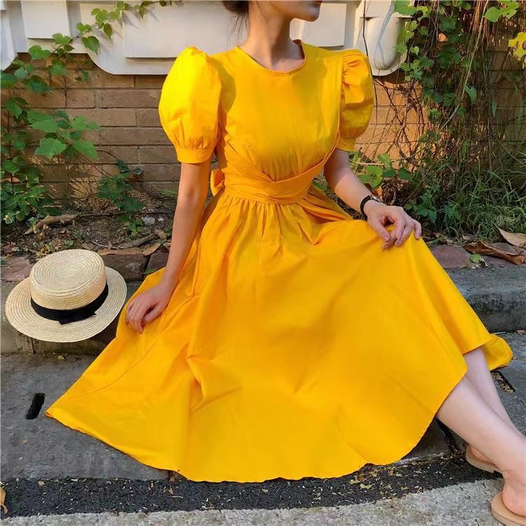 PROMO 2022 versi Korea baru dari gaun putih lengan pendek mid-length / rok pinggang kuning
