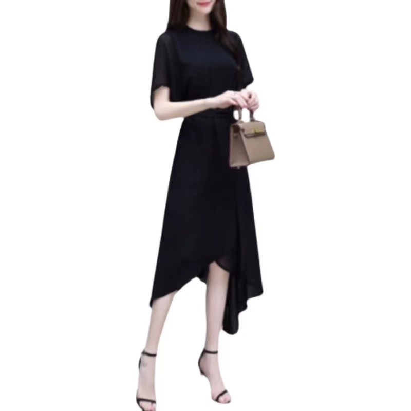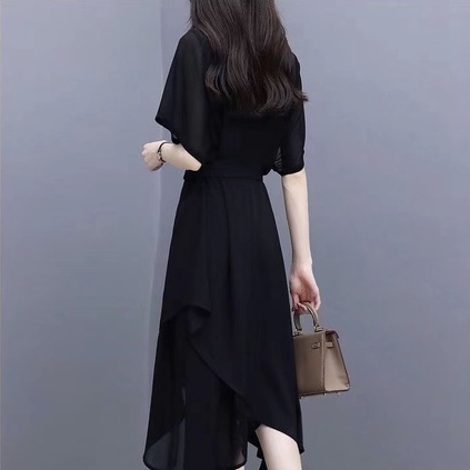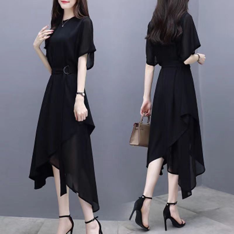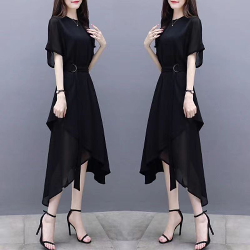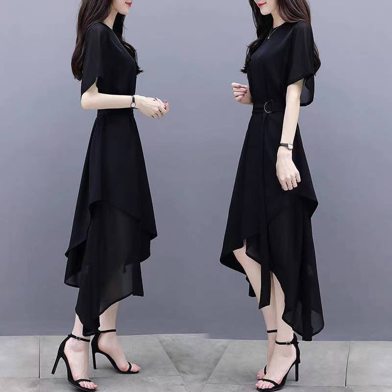 Baru Hitam Gaya Korea Lengan Pendek Gaun Sifon Tidak Teratur dress korea