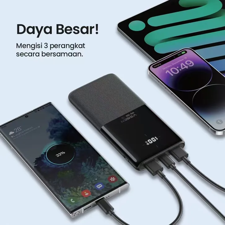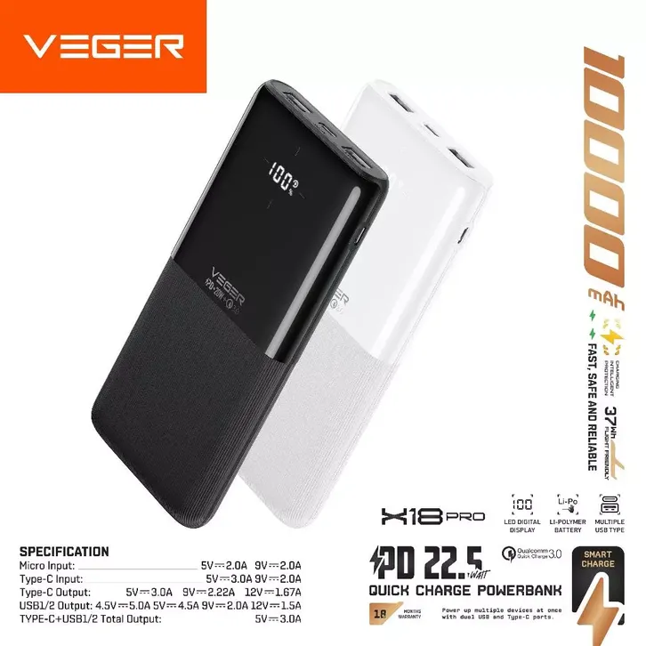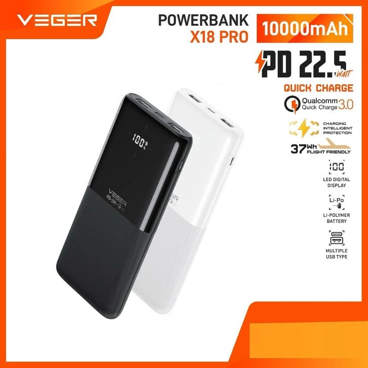 VEGER Powerbank X18 PRO 10000mAh Quick Charge 22.5W PD 20W Power Bank 2 USB LED Digital Display