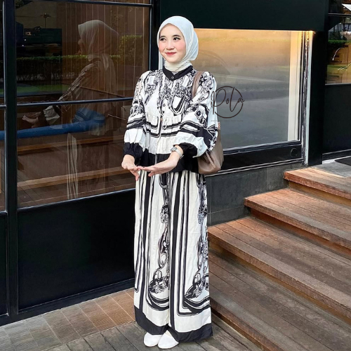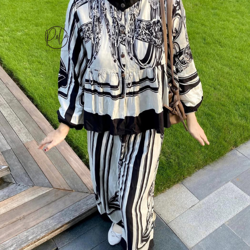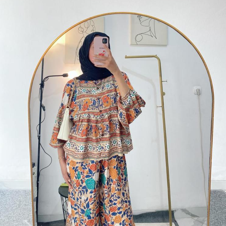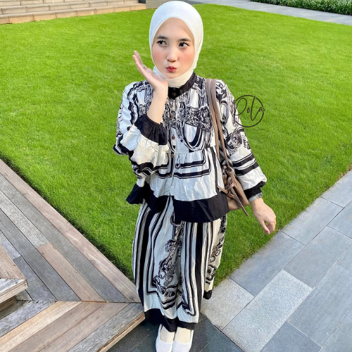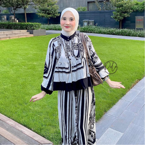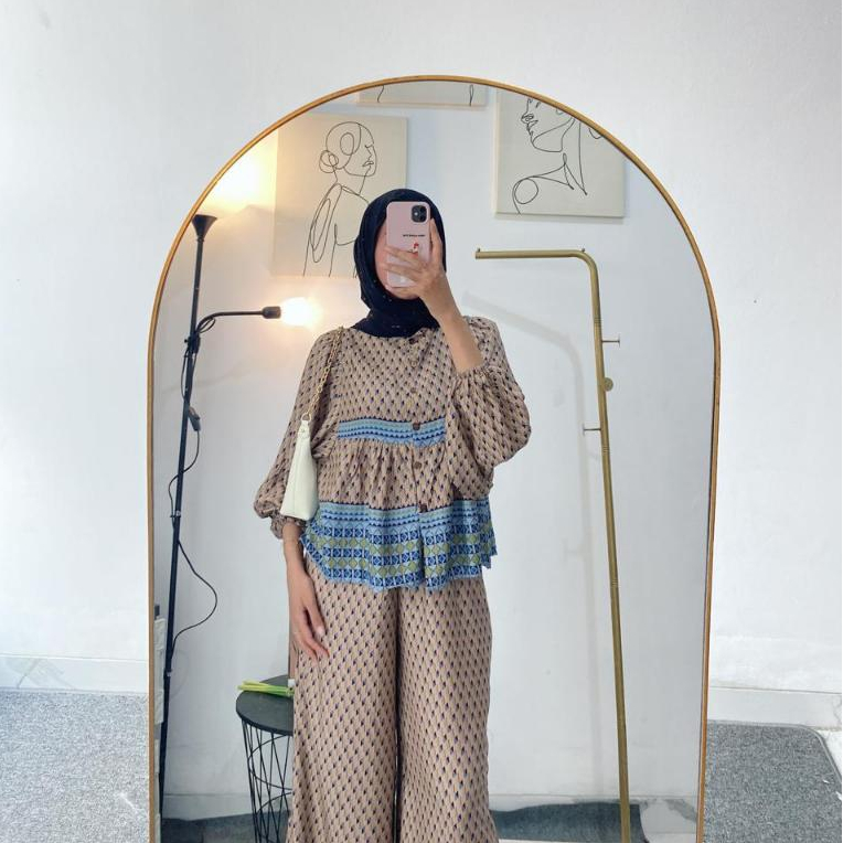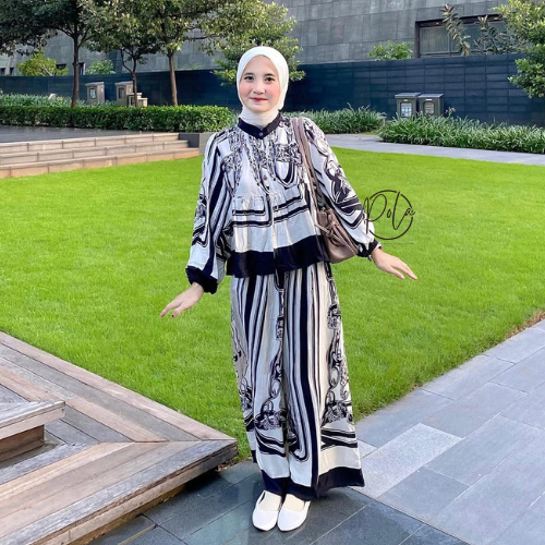 Rycca Oneset Rayon Wanita Lengan Panjang Motif Elegan Setelan Celana Atasan Casual Formal Oversize