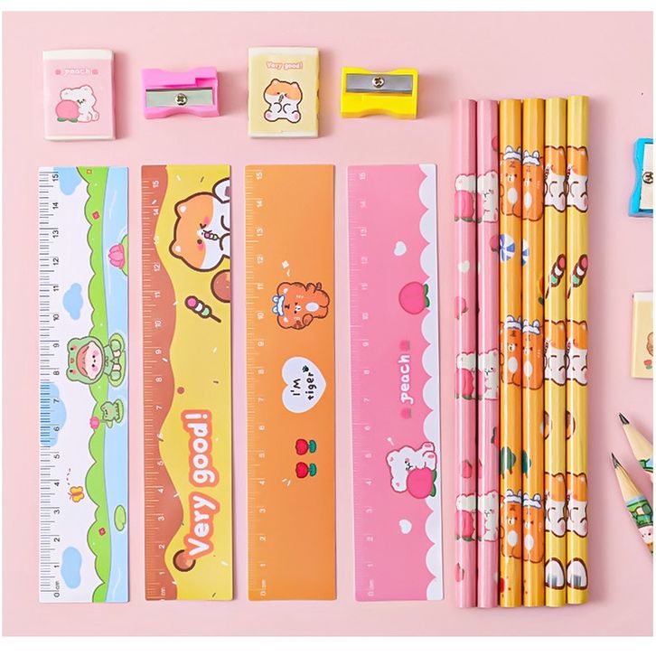 Paket Alat Tulis Stationery Set Pensil Penghapus Penggaris Lentur Serutan Rautan Lucu Imut Hewan