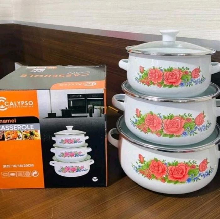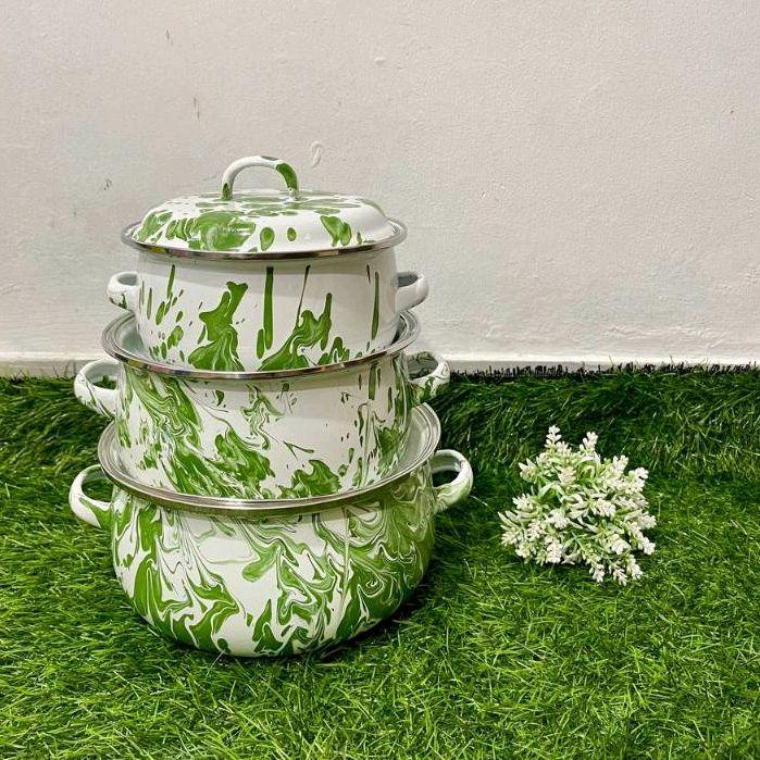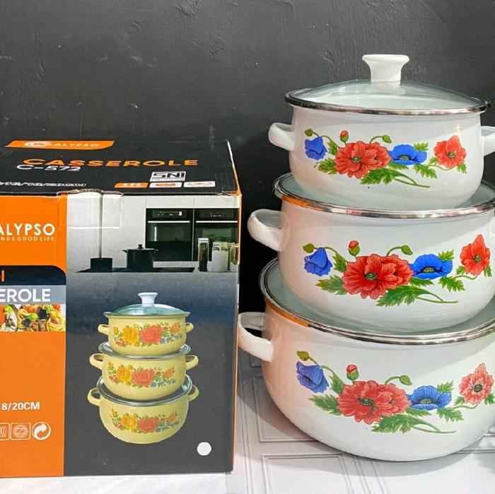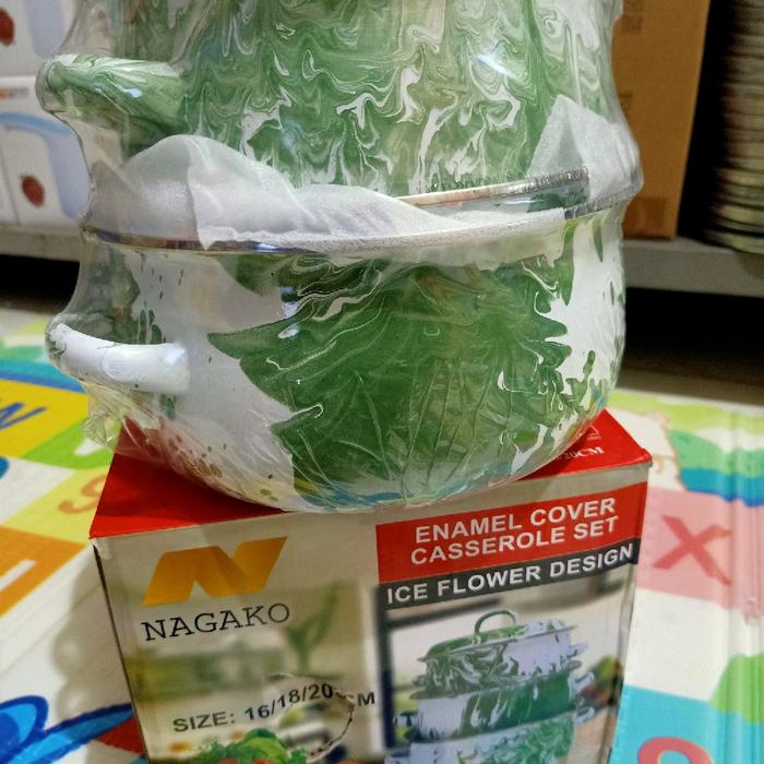 Promo Panci Enamel Bunga 3 Susun Set Tutup Kaca Kitchenware - Panci Blirik Hijau Elegan