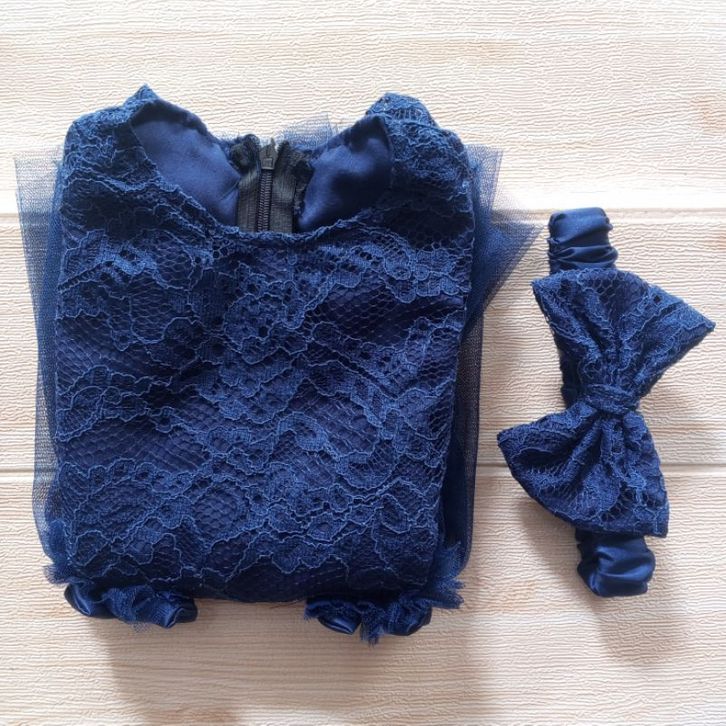 Dress Gaun Pesta Kondangan Anak Bayi Newborn 1 Tahun Brukat Tile Navy Free Bando Pita Anak
