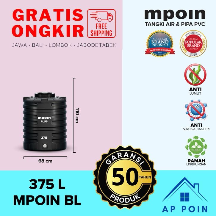 TOREN TANDON TANGKI AIR MPOIN PLUS BLOW 375 L ANTI LUMUT GARANSI 25 TAHUN