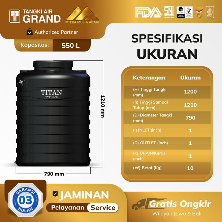 (KHUSUS BANDUNG) TANDON TOREN TANGKI AIR TITAN 550 L ANTI LUMUT & SERTIFIKASI HALAL GARANSI 3 BULAN