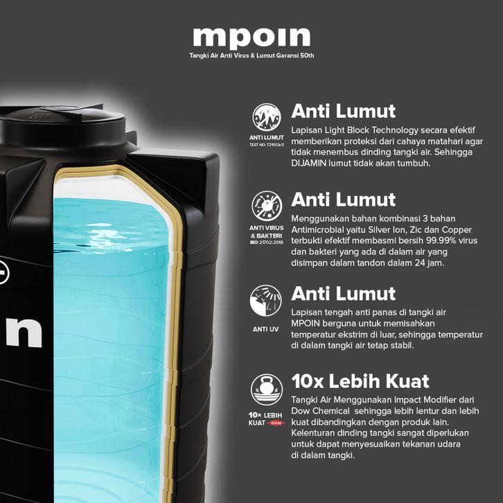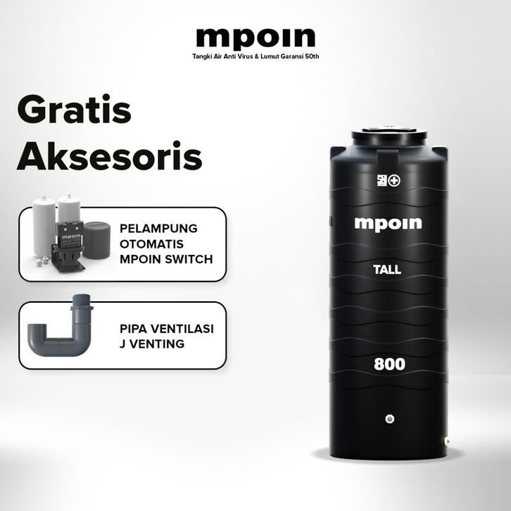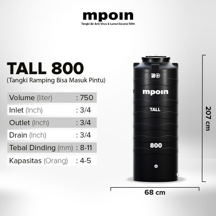TANDON TANGKI AIR MPOIN TALL 800 LITER DESAIN RAMPING- GARANSI 50 TAHUN - ANTI LUMUT & FOOD GRADE