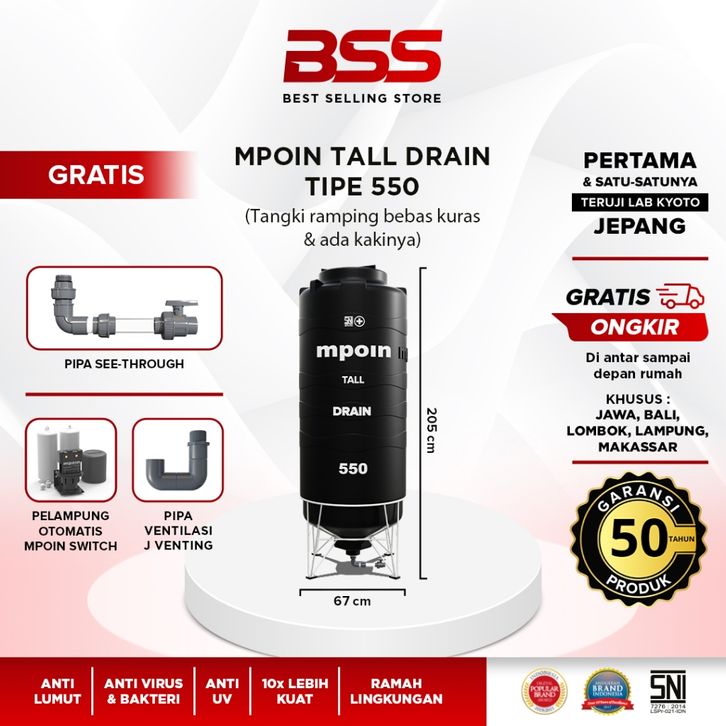 TANDON TANGKI AIR MPOIN TALL 550 LITER RAMPING BEBAS KURAS - GARANSI 50 TAHUN - ANTI LUMUT
