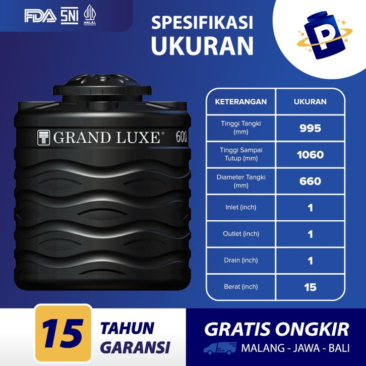 TANDON TOREN TANGKI AIR GRAND LUXE 600 L ANTI LUMUT SERTIFIKASI HALAL DI INDONESIA GARANSI 15 TAHUN