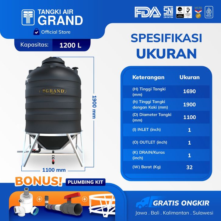 TANGKI TOREN TANDON AIR AUTO DRAIN 1200 LITER BEBAS KURAS