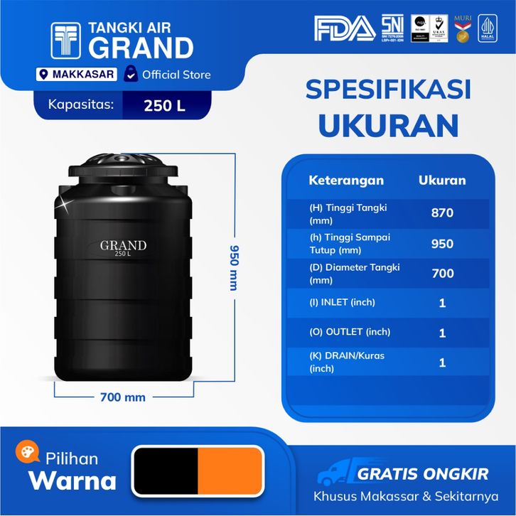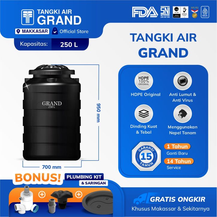 TANDON TOREN TANGKI AIR GRAND 250 L ANTI LUMUT & SERTIFIKASI HALAL DI INDONESIA GARANSI 15 TAHUN