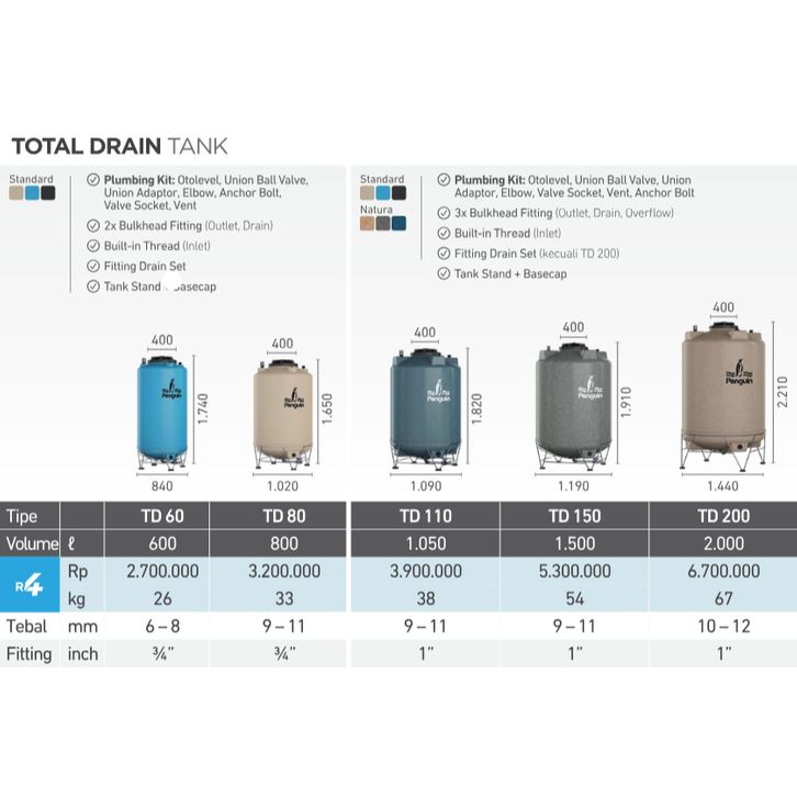 PENGUIN TD SERIES TOREN AIR PINGUIN TANGKI AIR TANDON 600L, 800L, 1050L, 1500L DAN 2000L TOTAL DRAIN