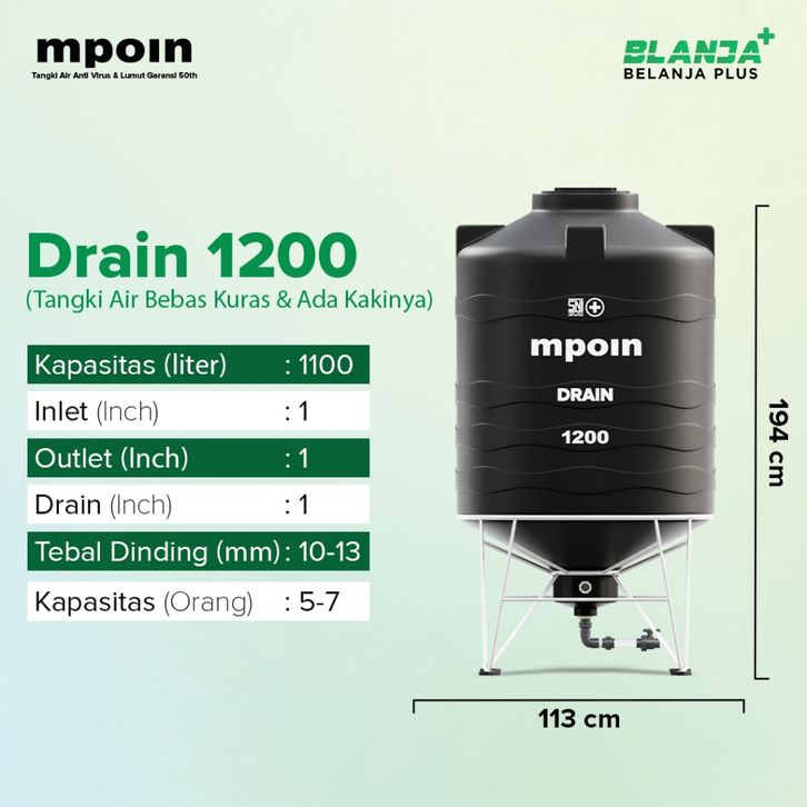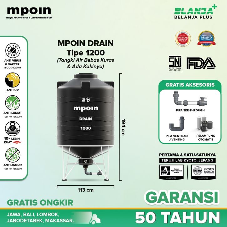 TANDON TOREN AIR MPOIN DRAIN 1200 LITER PLUS KAKI ANTI VIRUS ANTI BAKTERI ANTI LUMUT GARANSI 50TAHUN