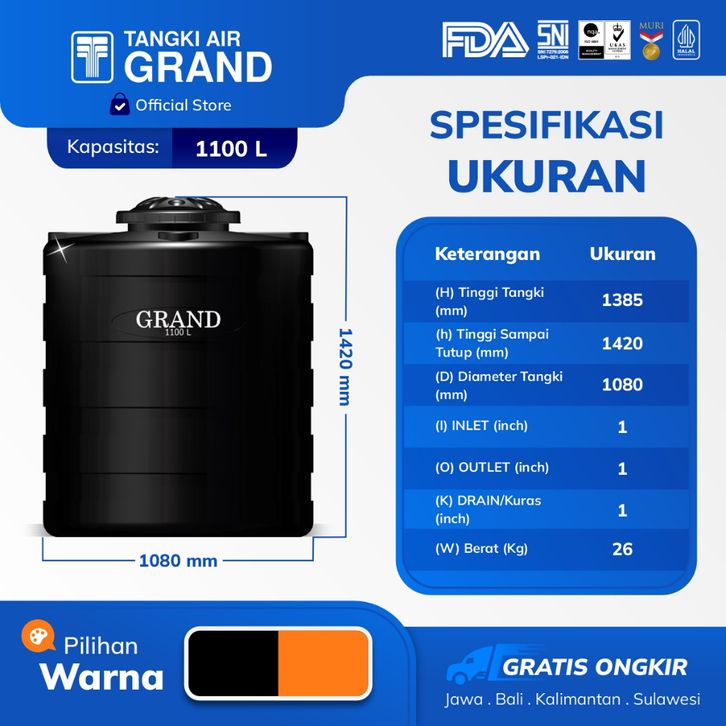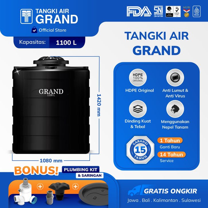 GRAND TANDON TOREN TANGKI AIR 1100L ANTI LUMUT GARANSI 15 TH