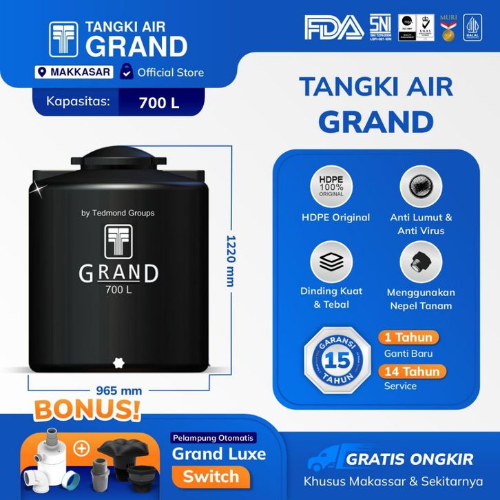 TANDON TOREN TANGKI AIR GRAND 700 L ANTI LUMUT & SERTIFIKASI HALAL DI INDONESIA GARANSI 15 TAHUN