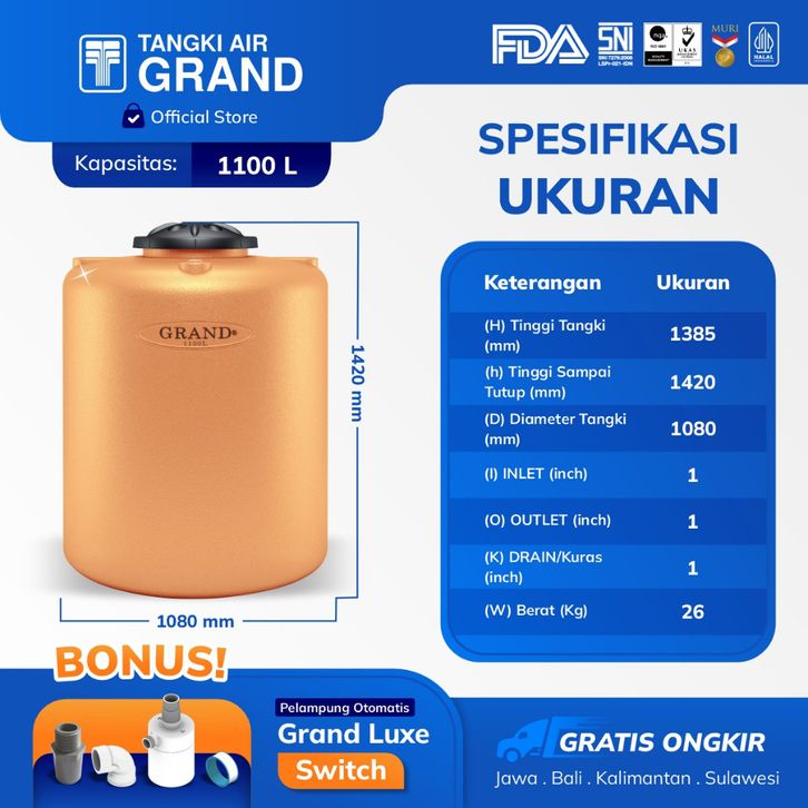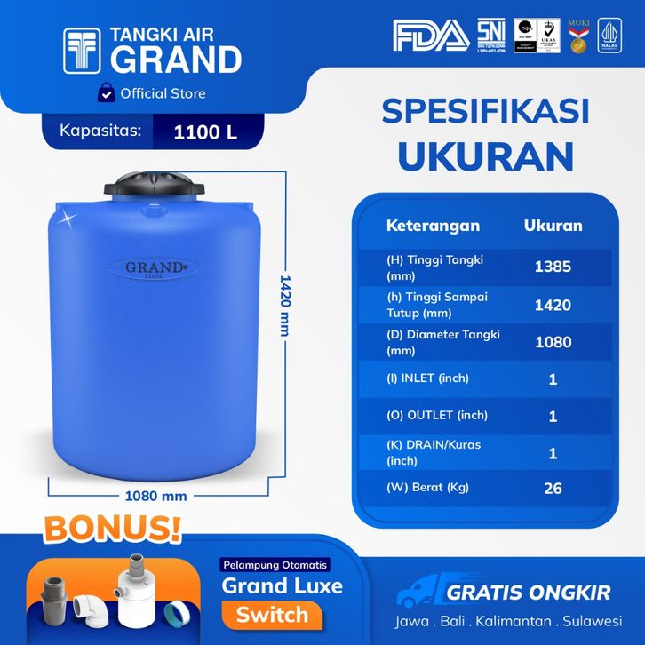 CUCI GUDANG TANDON TOREN TANGKI AIR GRAND 1100 L POLOS 1000 LITER ANTI LUMUT HALAL PERTAMA GARANSI 15 TAHUN