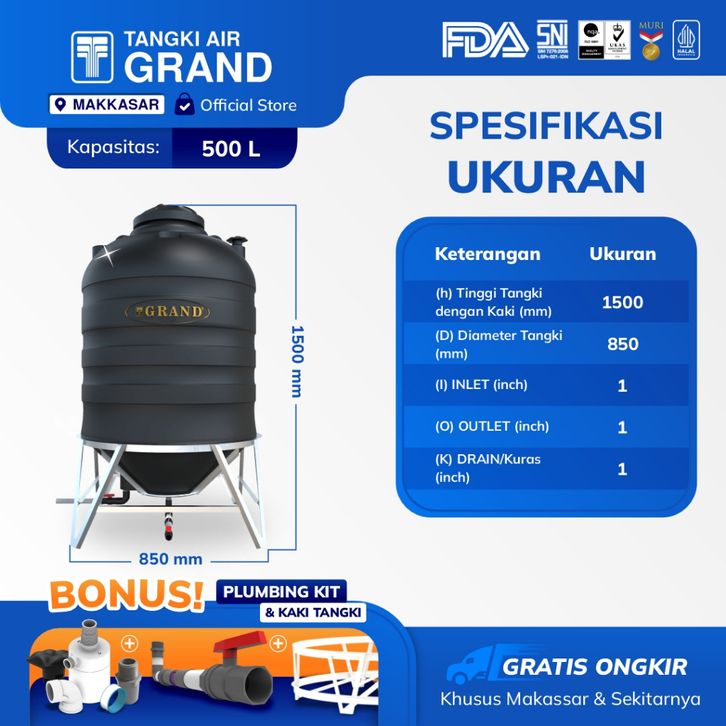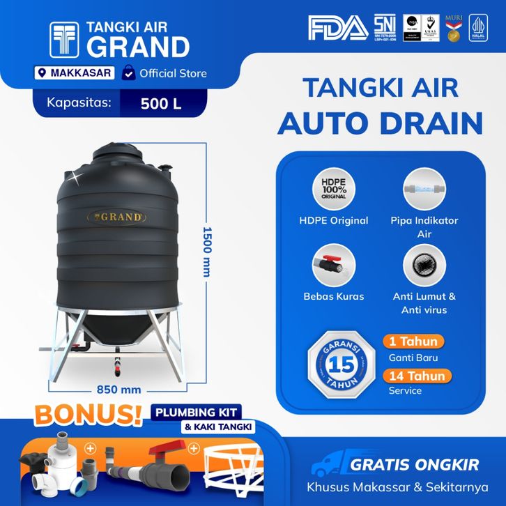 TANGKI TOREN TANDON AIR AUTO DRAIN 500 L BEBAS KURAS ANTI LUMUT & SERTIFIKASI HALAL GARANSI 15 TH