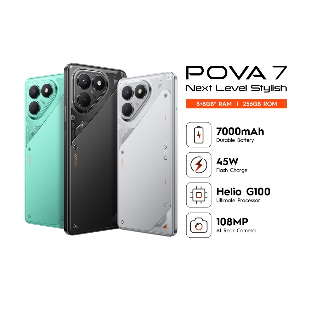 [Mall] TECNO POVA 7 8+8GB/256GB, 7000 mAh, Mediatek Helio G100 Ultimate, 120Hz Vivid Display , 108MP + 2MP Macro Camera