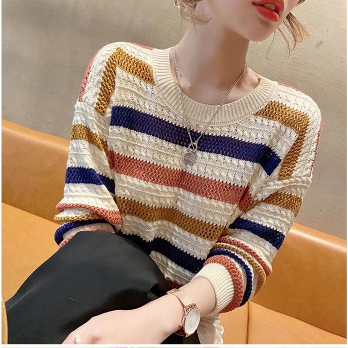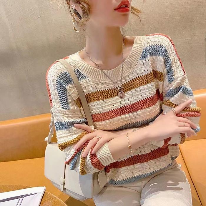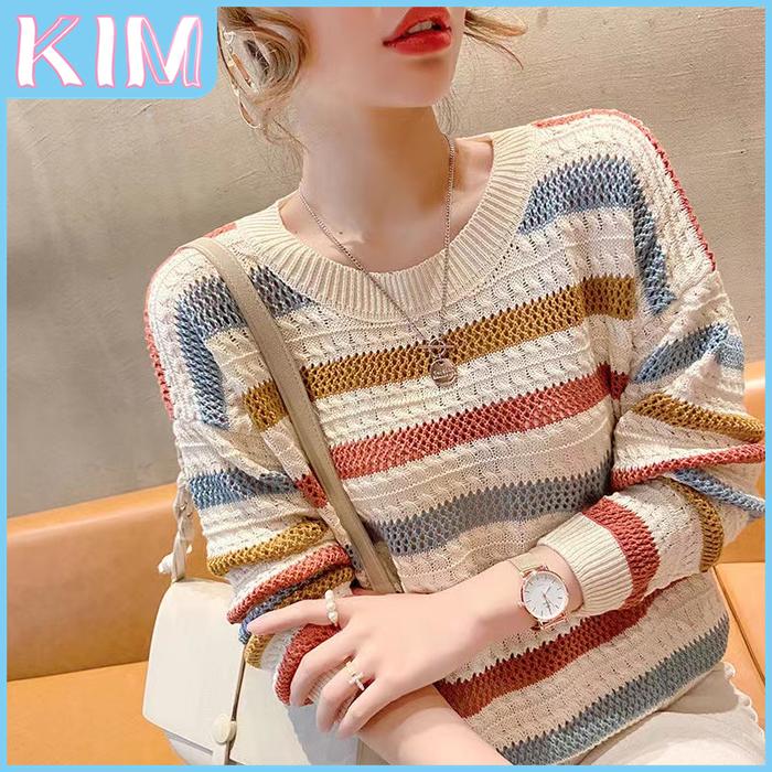 Murah Kim Top Knit Import Sweater - Atasan Wanita Rajut Jaring Import Stripes - Biru Elegan