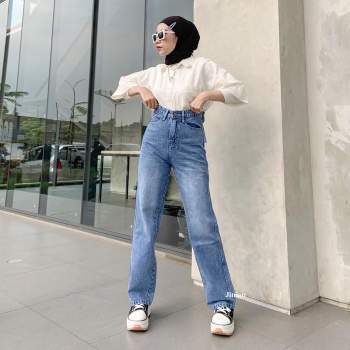 Promo JINISO HANGOVER - 852 Loose Highwaist Celana Jeans Wanita Warna Blue Acid Wishker - 27 Elegan