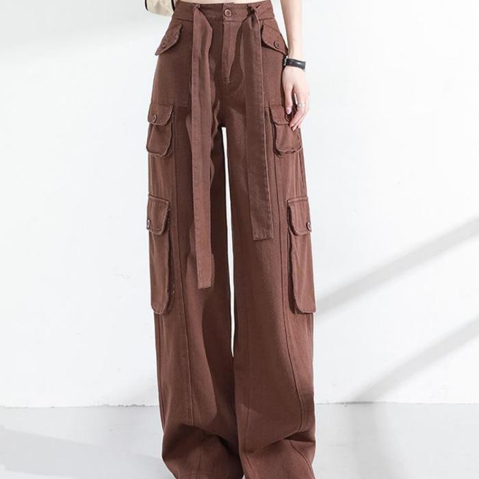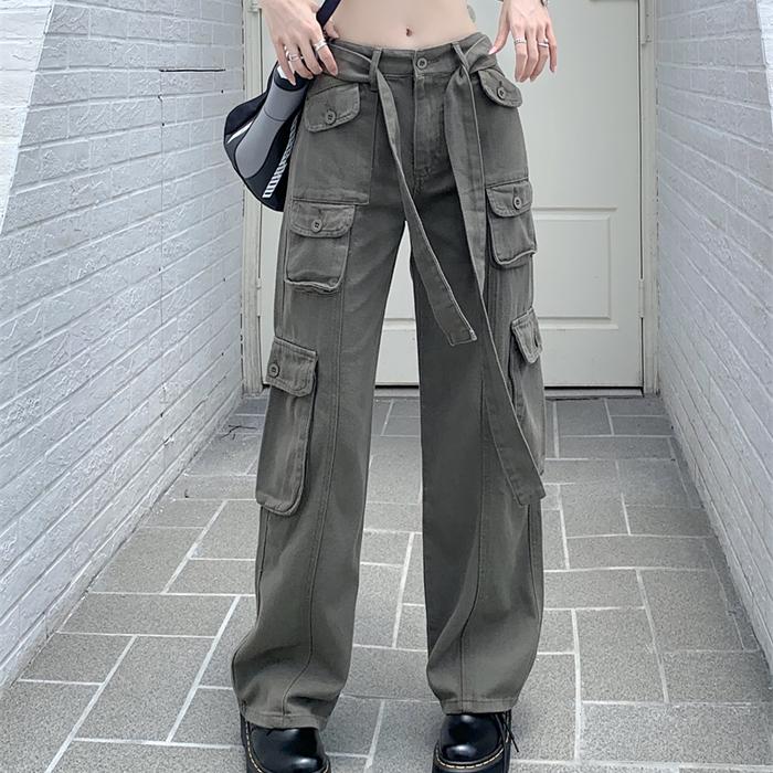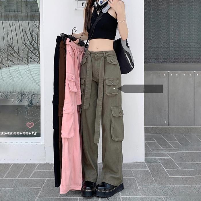 Promo Wanita Celana kargo Jeans Pinggang Tinggi Beberapa Kantong Longgar Celana Panjang Hitam - Merah Muda/Pink S Keren