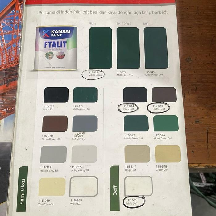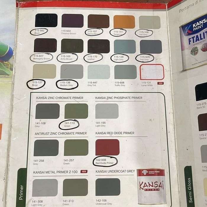 096 Azure Blue, 106 Ash Grey, 107 Sienna Brown, 110 Off White, 116 River Blue, 119 Cream, 123 Yukon Yellow, 125 Grass Green, 127 Beige, 128 Light Grey, 129 Middle Green, 137 Teak Brown, 138 Medium Grey, 141 Tangerine, 143 Permanent Red, 145 Autumn Orange, 147 Lemon Yellow, 158 Lucky Green, 159 Dresden Blue, 161 Mimosa, 170 Leather, 171 Bluebell, 172 Edelweiss, 178 Royal Blue, 180 Bright Green, 201 Hyatt Red, 204 Sprout Green, 207 Vita Cream, 221 Hino Green, 444 Banana Yellow, 445 Sunkist Orange, 446 Surf Blue, 448 Teracota, 582 Black, 600 Bright Orange, 601 Red Orange, 604 Ocean Green, 607 Mahogany Brown, 609 Iron Grey, 614 Victoria, 731 Super White