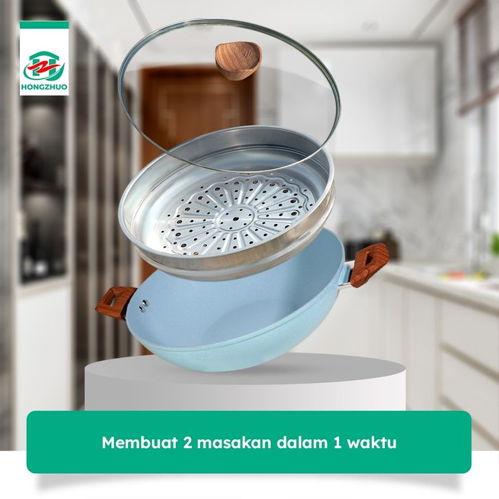 TERMURAH Tifale By Hongzhuo [2IN1] Wokpan 32CM + Glass Lid + Granite Steamer Non Stick / Alat Masak Wok dengan