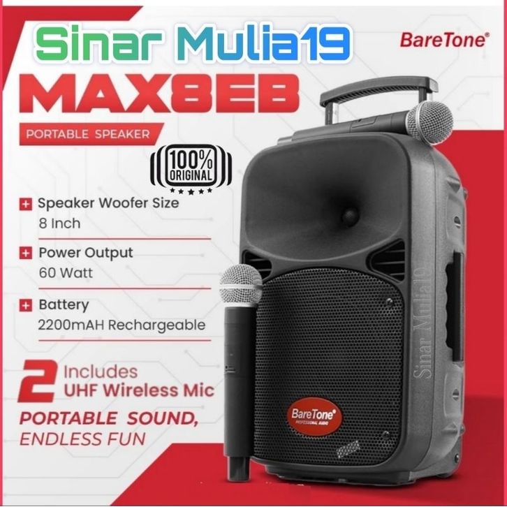 Speaker Aktif Portable Karaoke 8 Inch BareTone MAX08EB [ Max8eb ] TWS Bluetooth - USB