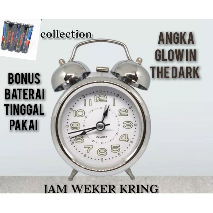 PREMIUM Jam Beker Alarm Bonus Baterai A2-Weker Besi Silver Angka Glow In The Dark udigk