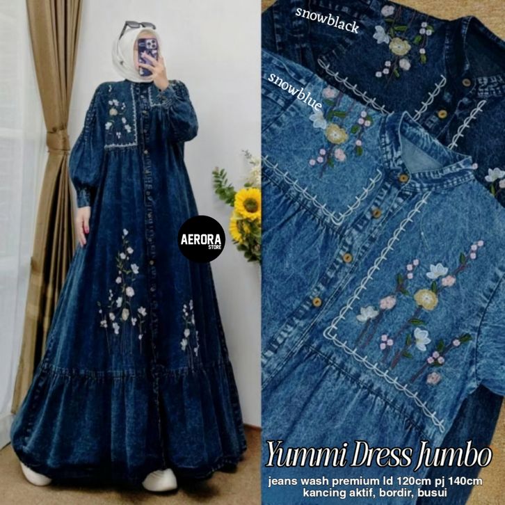Aerora Baju Gamis Dewasa Jeans Jumbo Wanita Terbaru 2025 Dress Modern Busui Bordir Rampel Yummi