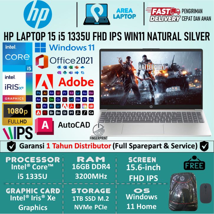 Laptop Laptop Business Slim HP 15 Series i5 1335U 16GB 1TB SSD Iris Xe FHD FingerPrint Win11 Silver