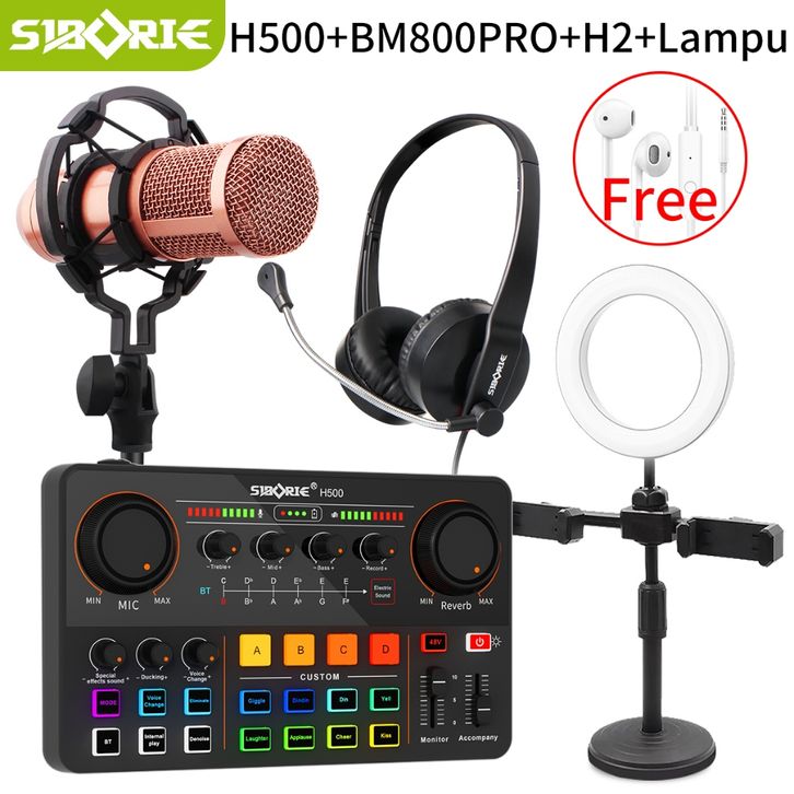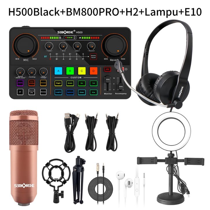 SIBORIE SOUNDCARD H500+BM800PRO MIC+H2 HEADPHONE+LAMPU SET MIXER BLUETOOTH SOUND CARD MIC AUDIO USB EKSTERNAL PRESENTING