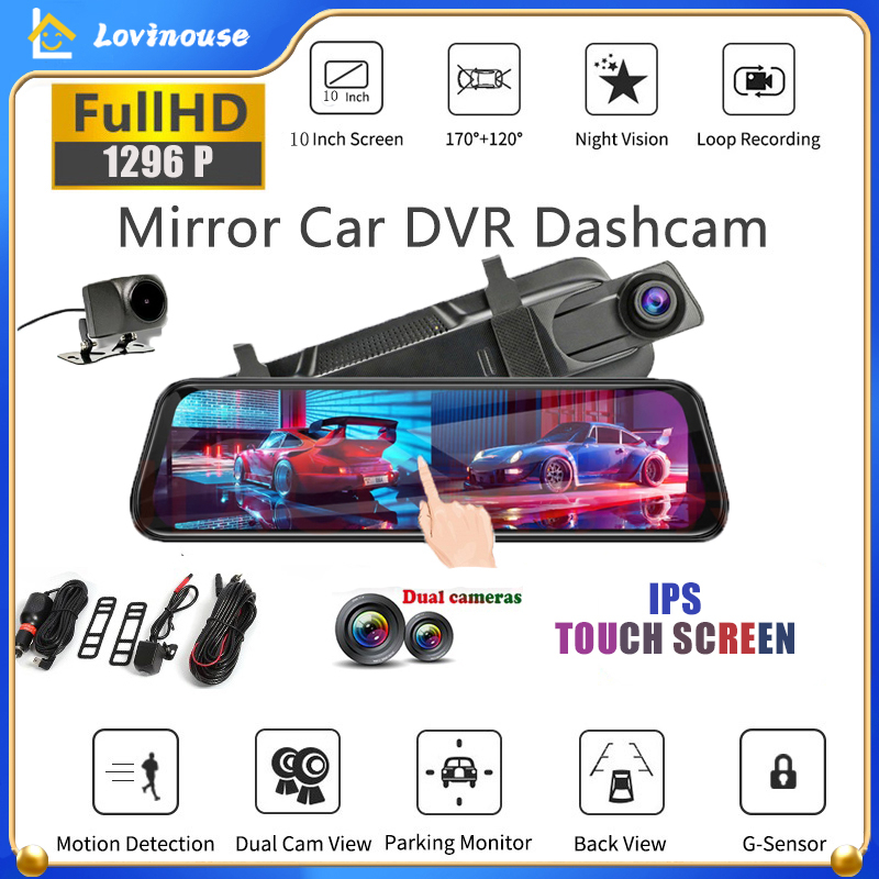 ⭐+32 GB SD⭐Lovinous Dash Cam DVR 10'' IPS Touch Screen kamera dasbor 1296P Dash cam Mobil Dual Lens Rearview Mirror 170°