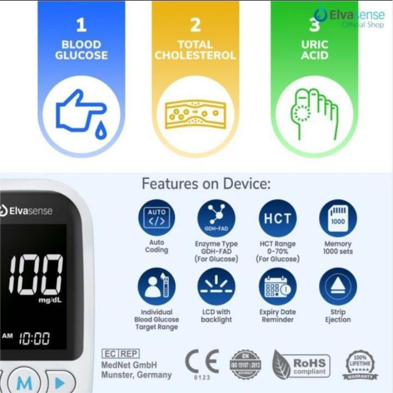ELVASENSE 3IN1EMS ALAT CEK KOLESTROL GULA DARAH & ASAM URAT Paket hemat lengkap