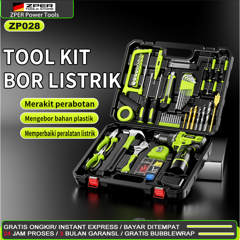 ZPER SATU SET ALAT PERKAKAS BOR LISTRIK CORDLESS TANG OBENG PALU KUNCI PAS TOOLKIT 124 IN1 PCS