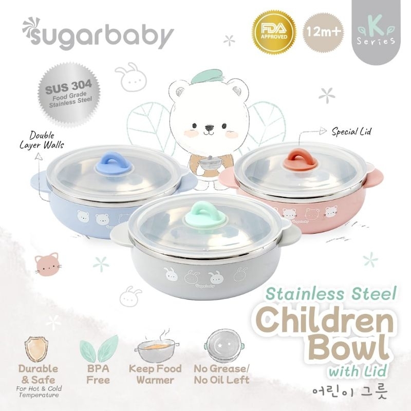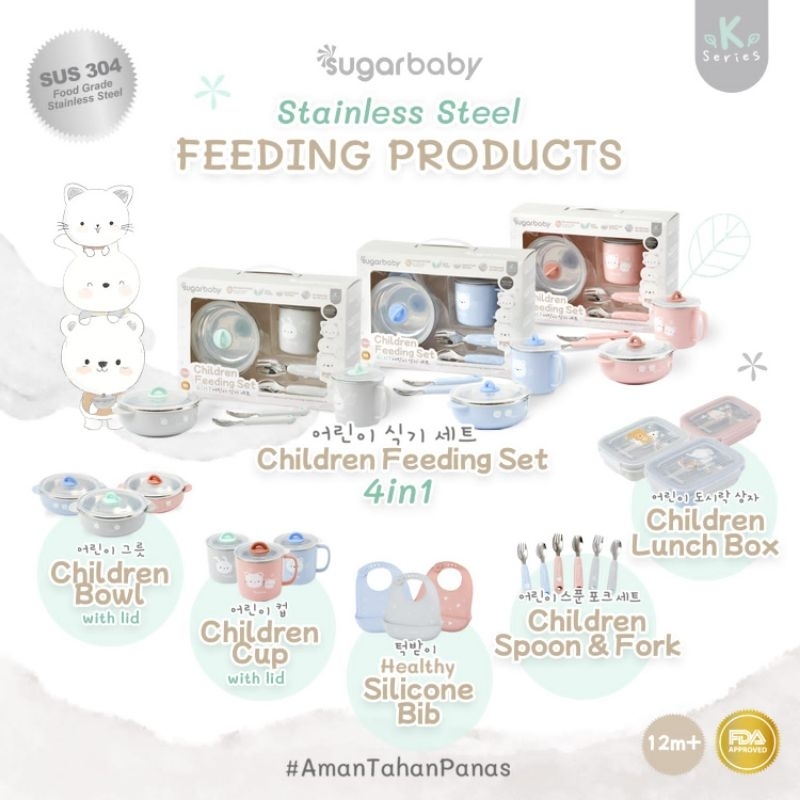 Sugar Baby Stainless Steel CHILDREN LUNCH BOX / BOWL CUP with LID SPOON & FORK Set / SILICONE BIB