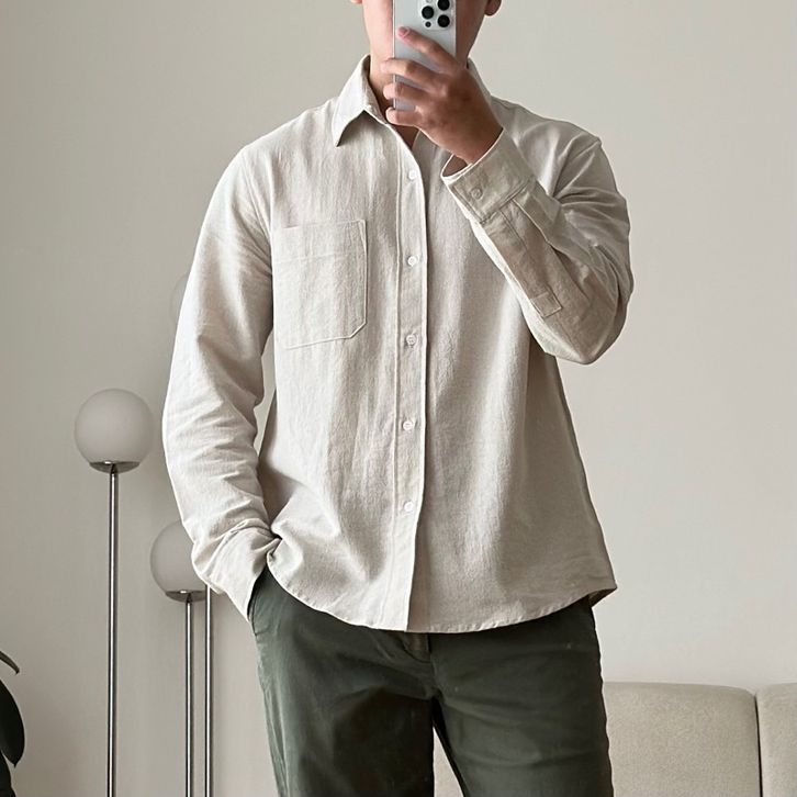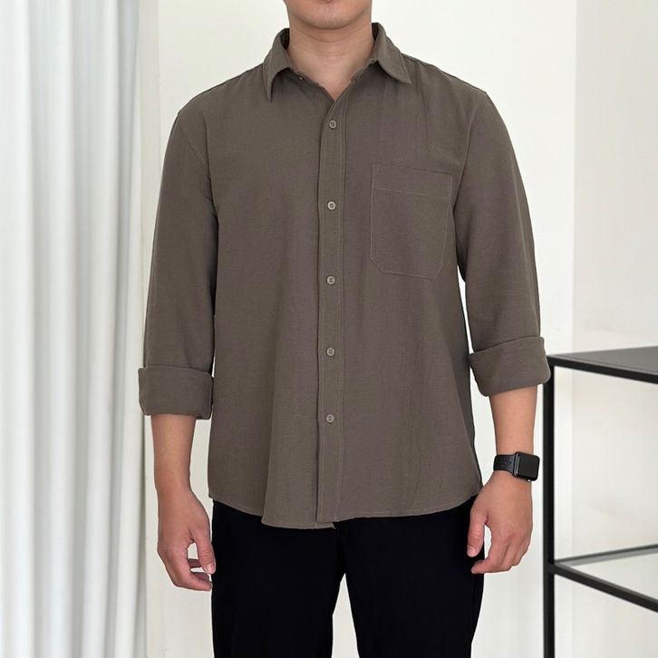 Kemeja Linen COZYCLUB Pria Lengan Panjang Atasan Polos Kasual Formal Long Sleeve Shirt