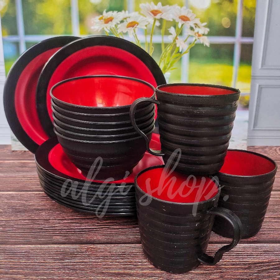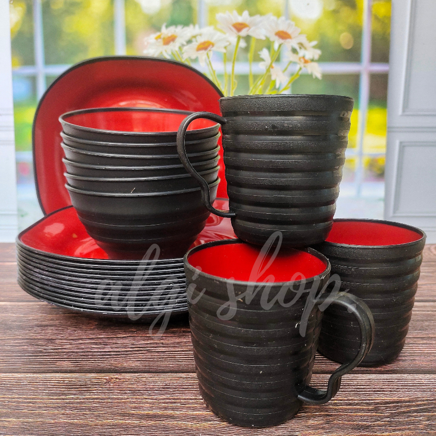 12PCS RAMEN SEAT GRATIS SENDOK ISI 4PIRING 4MANGKUK 4 GELAS RAMEN HITAM MERAH SUPER MEWAH