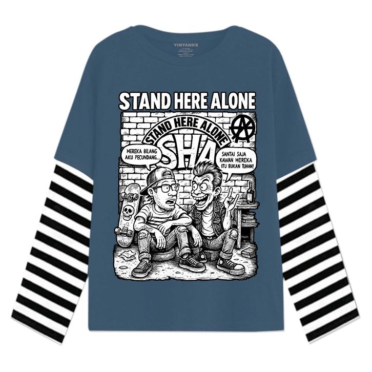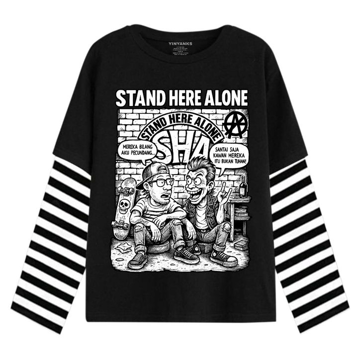 Kaos Pria Distro Bandung Yinyanks T-shirt Double layer Ynyks Stand here alone kaos long sleeve pria wanita unisex