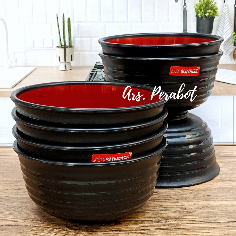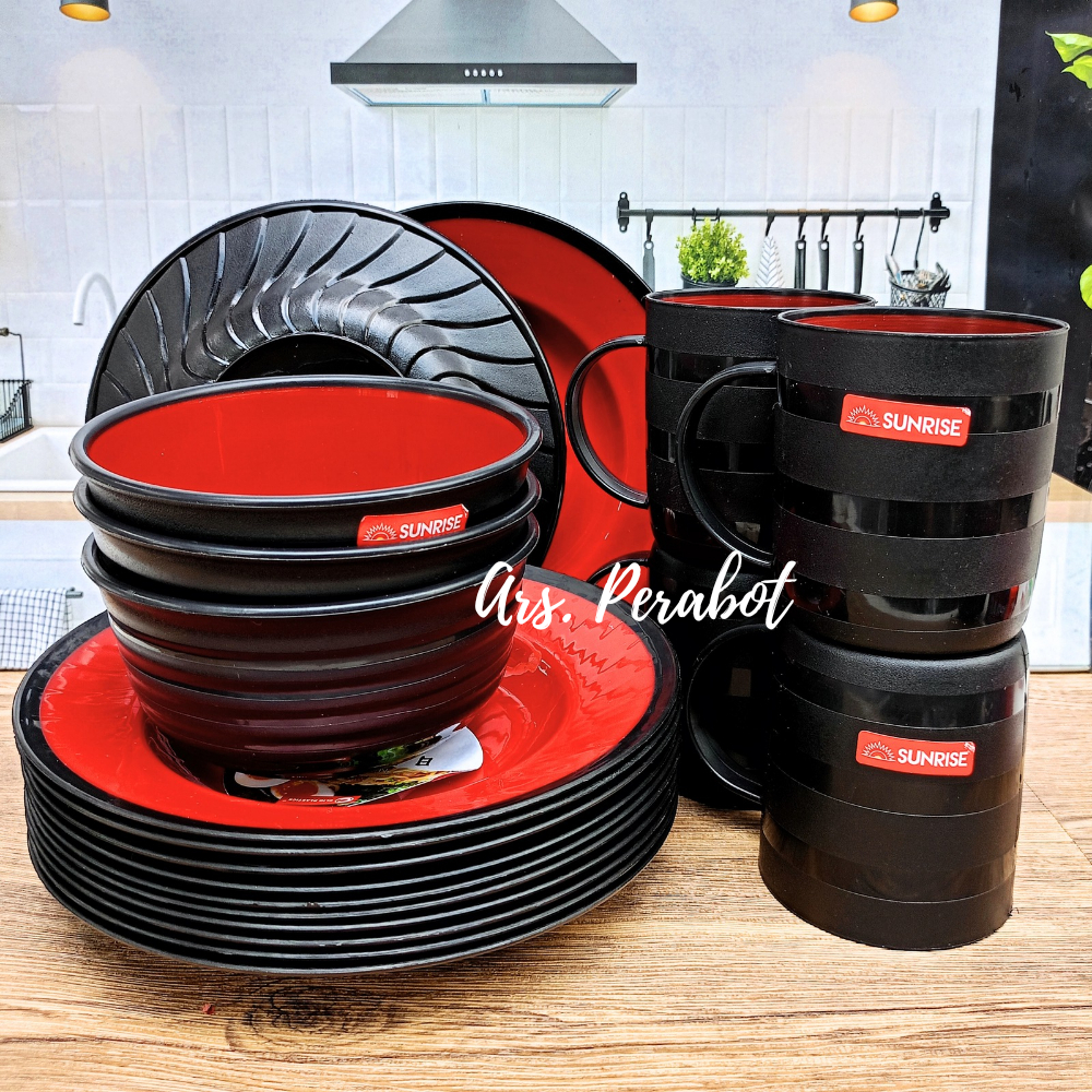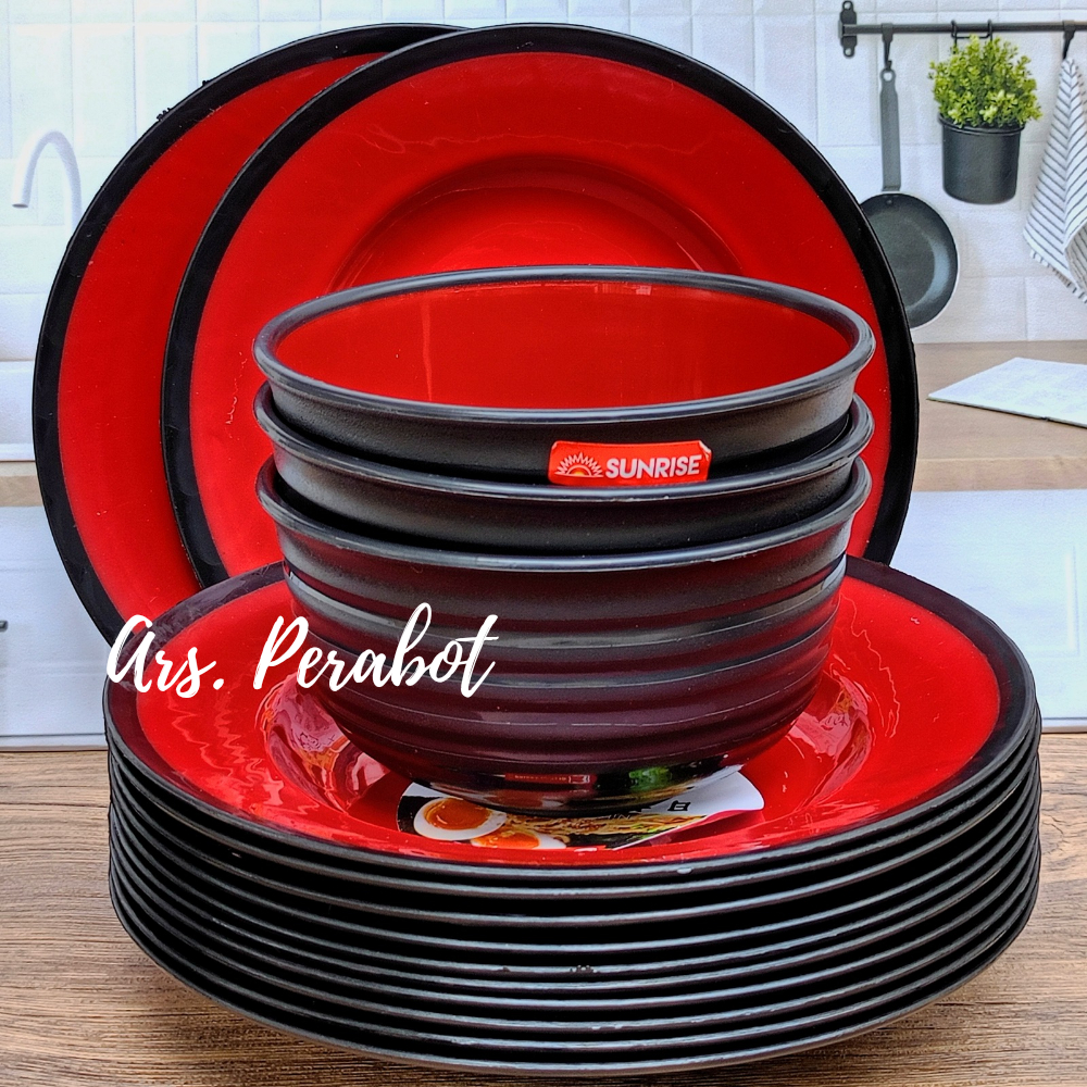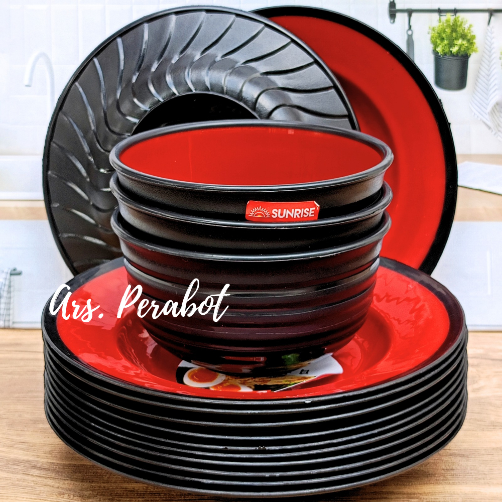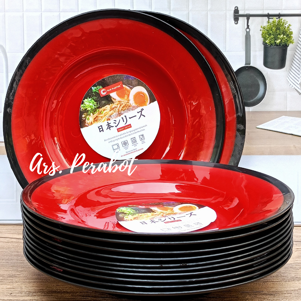 Promo 12Pcs paket ramen lengkap 4Piring bulat 4Mangkuk 4Gelas ramen hitam merah