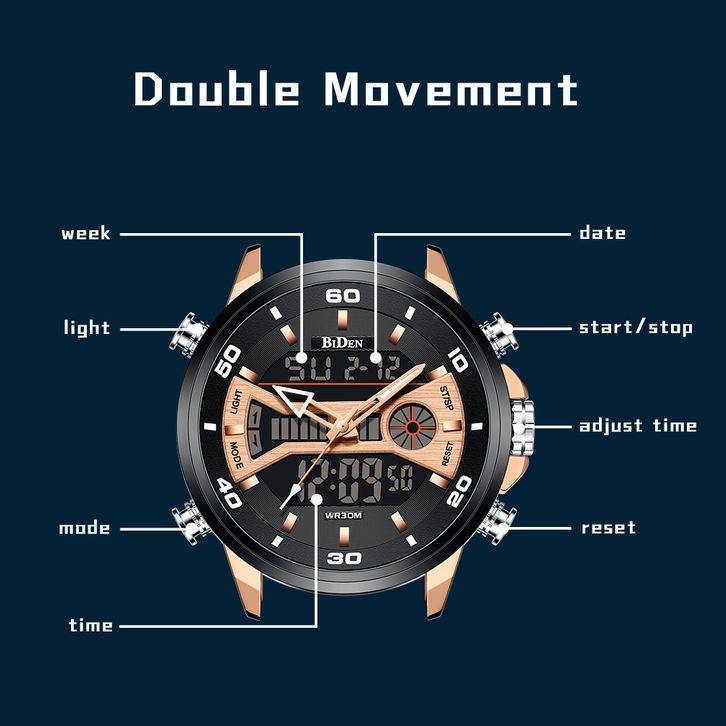 BIDEN Jam Tangan Pria Olahraga Anti Air Jam Analog&Digital Tali Kulit Minggu/Tanggal/Waktu Ganda