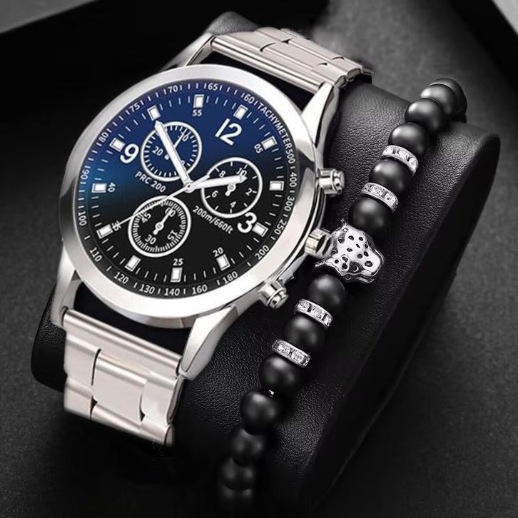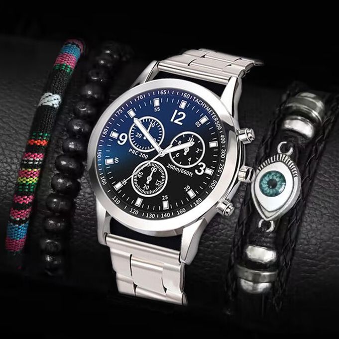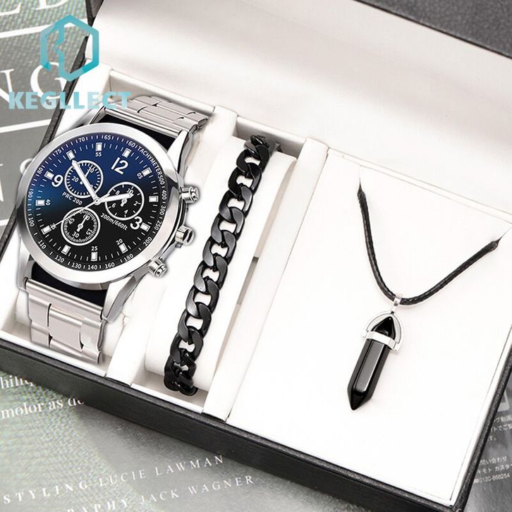 Jam Tangan Kuarsa Gaya Bisnis Pria Tali Baja Tahan Karat Dial Besar dengan Aksesori 5 Set