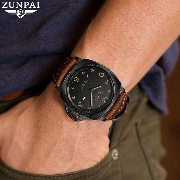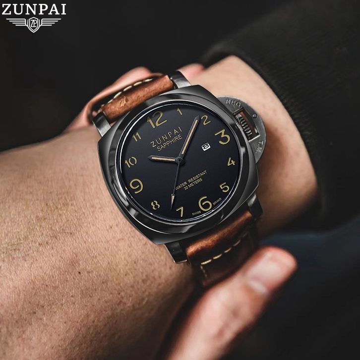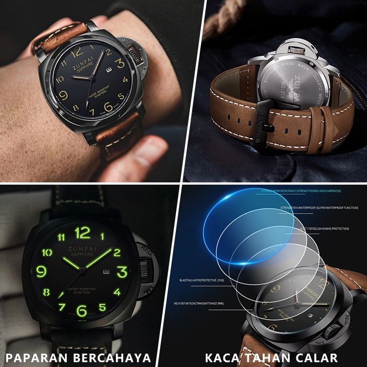 ZUNPAI Jam Tangan Pria Anti Air Kulit Asli Bisnis Bercahaya Multifungsi Otomatis Tanggal Chronograph