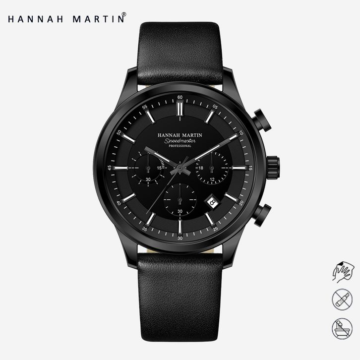 HANNAH MARTIN Jam Tangan Pria 100% Original Kronograf Premium Hitam Kulit Tahan air Quartz Analog