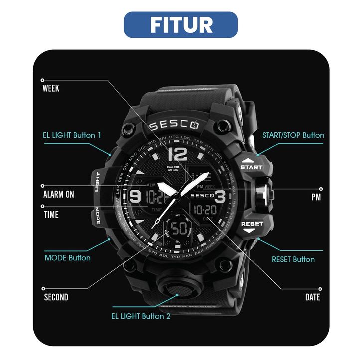 SESCO 9208 Jam Tangan Pria Cowok Digital Analog Anti Air Original Dengan Tali Karet