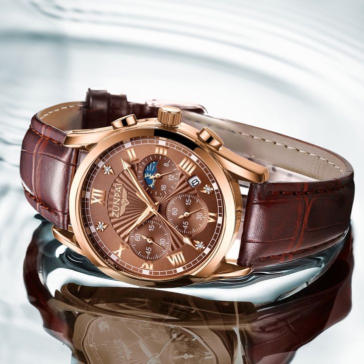 ZUNPAI Jam Tangan Pria Asli Anti Air Kulit Keren Bisnis Bercahaya Hitam Coklat Mewah Chronograph