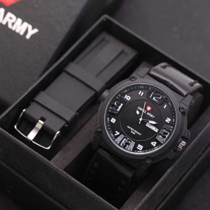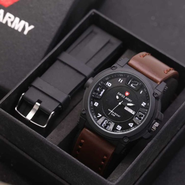 JAM TANGAN PRIA SWIS KULIT LEATHER TANGGAL HARI AKTIF PAKET FULL SET FREE 1 TALI KARET