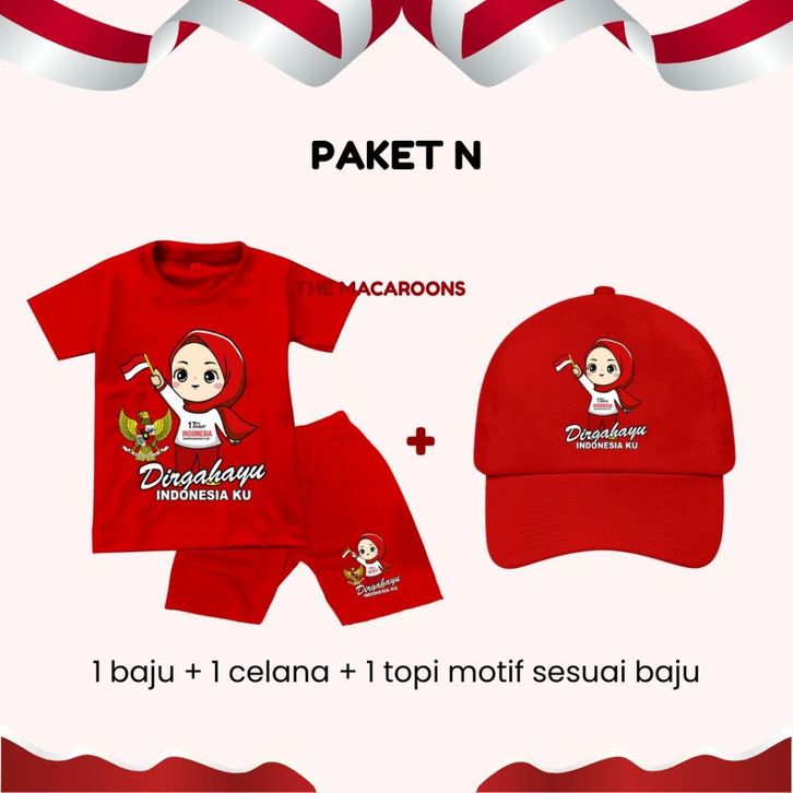 [PAKET LENGKAP] Setelan Kaos + Topi Anak 17 Agustus Baju Celana Topi Kemerdekaan Acara Pawai